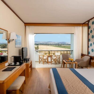 Dit 4 sterrenhotel ligt direct aan zee in Kato Paphos en staat voor rust, luxe en een vleugje romantiek. Bars, winkels en bezienswaardigheden liggen op loopafstand en een bushalte voor de deur brengt je overal naartoe. Alle kamers hebben een ruim balkon met uitzicht op zee of de tuinen. Overdag lekker zwemmen, tennissen of ontspannen in de spa. En ’s avonds geniet je in een van de vijf restaurants van mediterrane en Italiaanse gerechten of zomerse thema avonden. De perfecte afsluiter? Cocktails en zeezicht in de St. Andrew’s Rooftop Bar.